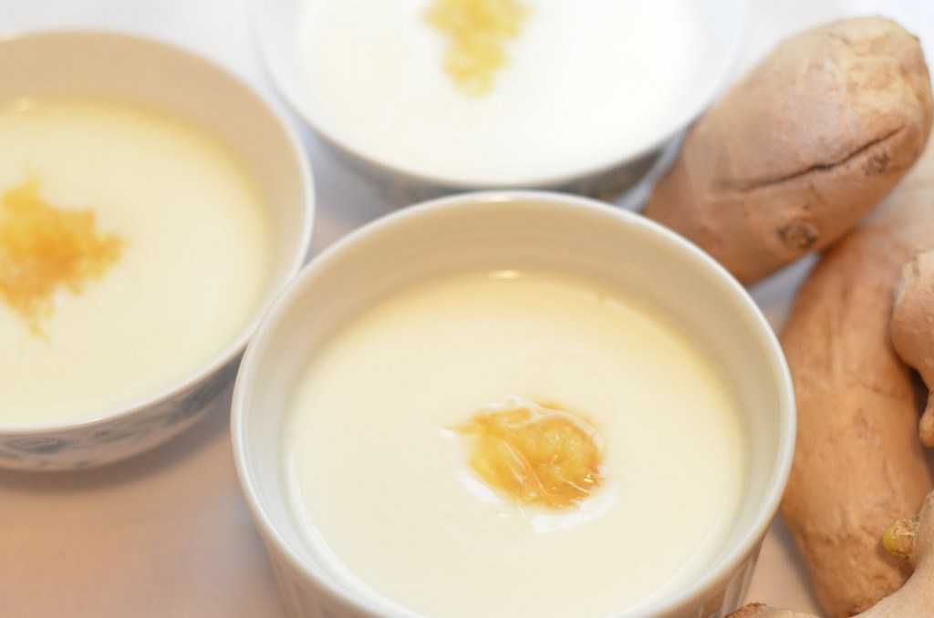 Натирают имбирь, отжимают ложкой сок, аккуратно сливают, чтобы осадок не попал в будущий десерт. Вливают к молочно-белковую смесь. Опять перемешивают — рекомендуется дополнительно процедить. Разливают жидкость по формочкам. Если на поверхности будут пузырьки, их снимают чайной ложкой, обернутой чистой марлей. Сверху формочки затягивают пищевой пленкой. Пароварку разогревают, устанавливают в нее формочки, готовят 15 минут. Застывший пудинг сначала охлаждают при комнатной температуре, а затем дают застыть в холодильнике.