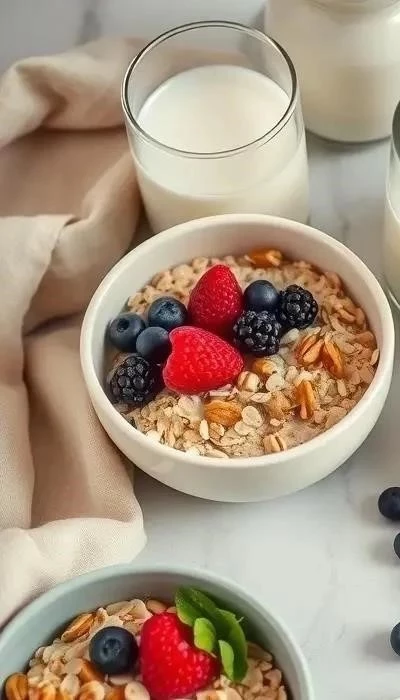 - Завтрак: Овсяная каша на молоке с фруктами и орехами, яйцо.