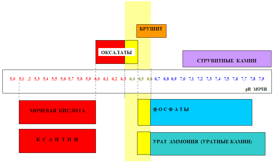 В моче присутствует множество солей в растворенном виде. Изменение ее кислотности приводит к снижению растворимости солей, они начинают образовывать кристаллы и выпадать в осадок. Аморфные фосфаты перестают быть растворимыми при рН больше 8,0.