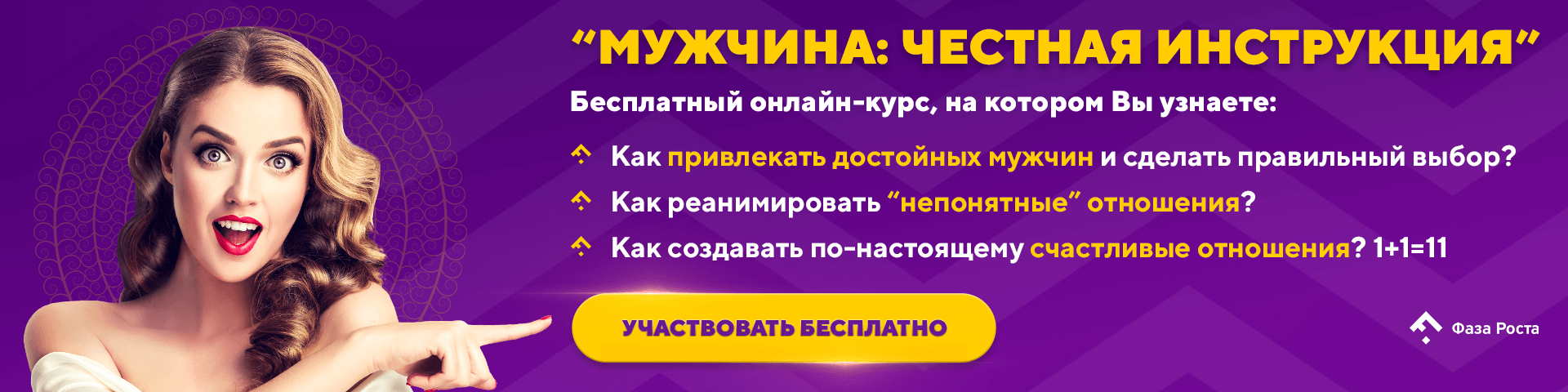 Но если эта статья вам откликнулась, тогда приглашаю на мой бесплатный вебинар “Мужчина: честная инструкция по применению. Без драм и манипуляций”. На нем у вас будет возможность понять, в чем именно ошибка в восприятии мира и себя. Я расскажу, что делать, чтобы построить гармоничные отношения с мужчиной и стать счастливой женщиной.