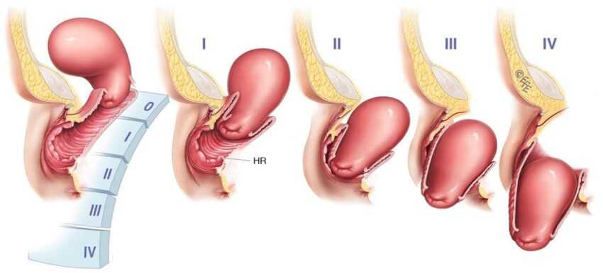 | IV | Зияет | Видны в спокойном состоянии снаружи | Неполное выпадение матки — выступает за предверье вагины | |