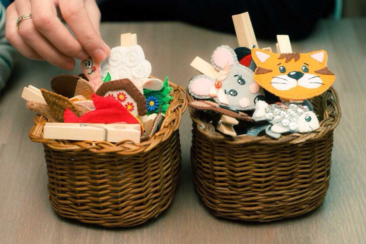 * Поиграйте с прищепками! Пусть ребёнок развешивает сушиться кукольную одежду. А если присоединить прищепки к желтому кругу, вырезанному из картона, то получится солнышко!