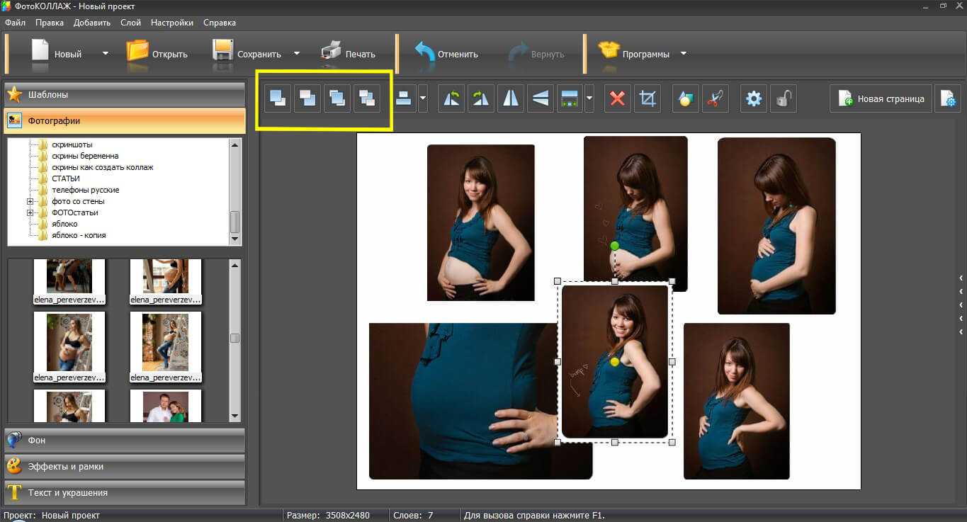 Перетаскивайте объекты, меняя их местами. Это касается не только снимков, но и элементов декора, надписей и т.п. Устанавливайте очередность слоев, задействовав кнопки с изображением листа. Вы найдете их справа на панели действий.