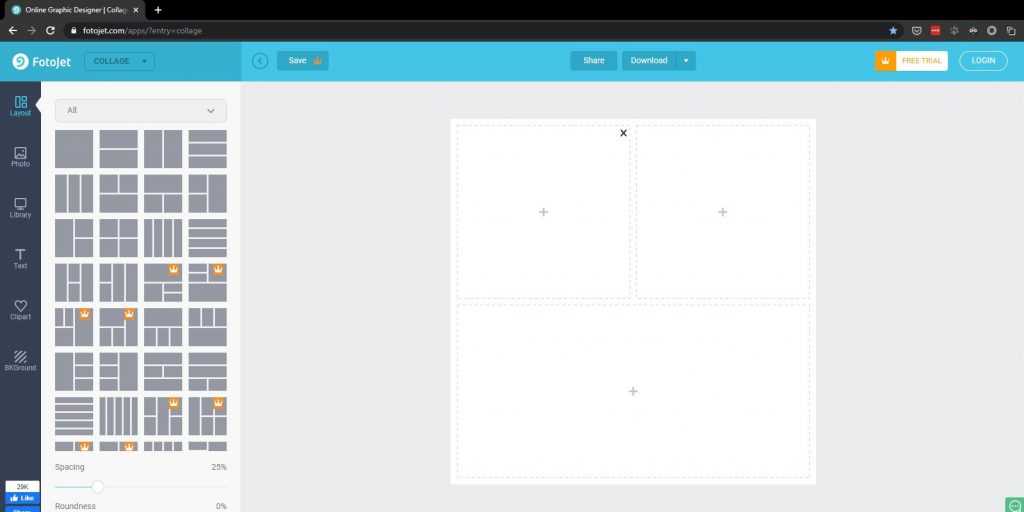 FotoJet тоже совмещает функции менеджера коллажей и редактора фотографий. Внутри вы найдёте шаблоны, которые помогут вам быстро создавать графику для открыток, постеров и социальных сетей. Сервис также содержит немало сеток и стикеров. На изображения можно добавлять пользовательский текст. У FotoJet есть и десктопные версии, но в бесплатном режиме они оставляют на изображениях водяные знаки.