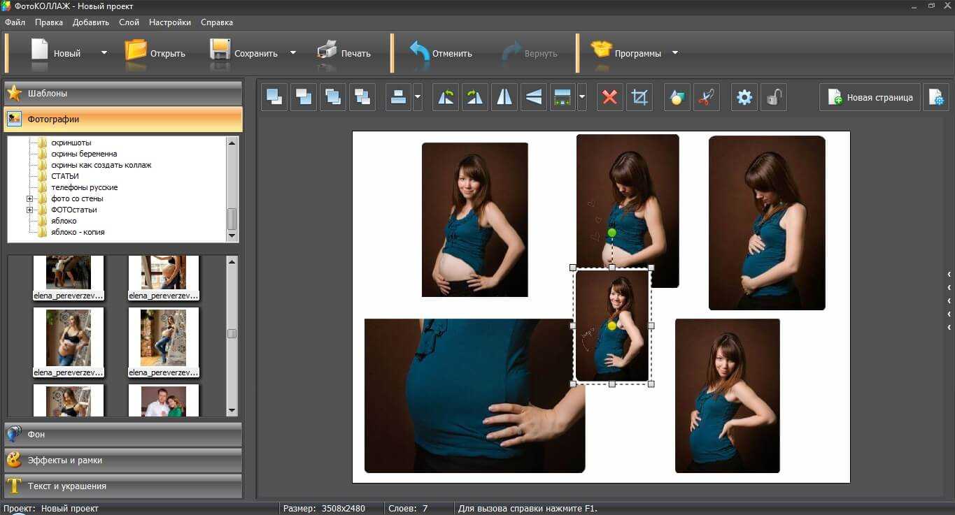 Первым делом программа предложит добавить на лист снимки, из которых будет состоять коллаж из детских фото. Найти нужные фотографии можно в списке на панели слева. Просто выберите нужную папку, а потом последовательно перетащите изображения на страницу и настройте их положение. Не переживайте, если точно не знаете, как лучше расставить фото. Вы всегда сможете поменять положение снимков на листе: перетащить их в другое место, повернуть, увеличить или уменьшить.