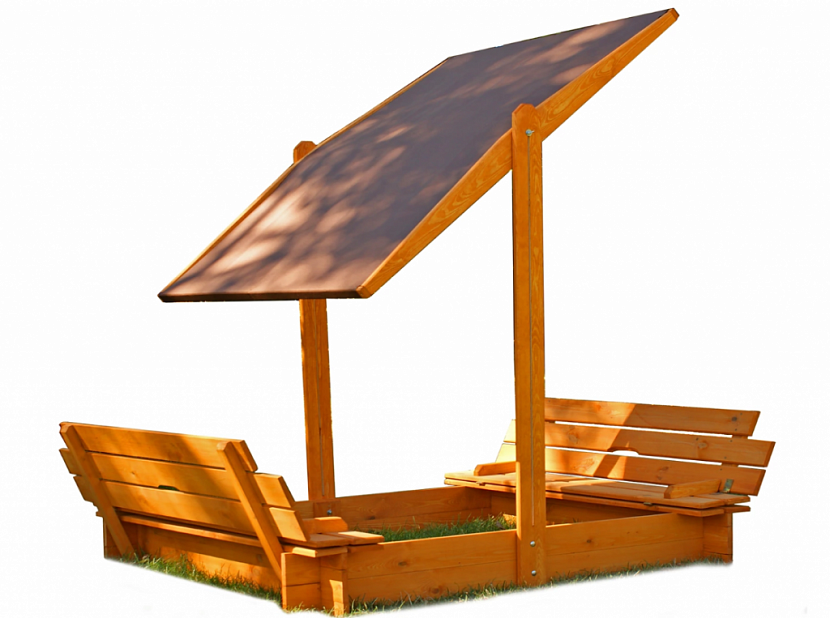 Также в магазинах и специализированных фирмах можно встретить множество деревянных песочниц. Одна из самых распространенных моделей представляет собой конструкцию с крышей и крышками. Навес может менять свою высоту в зависимости от пожеланий ребенка.