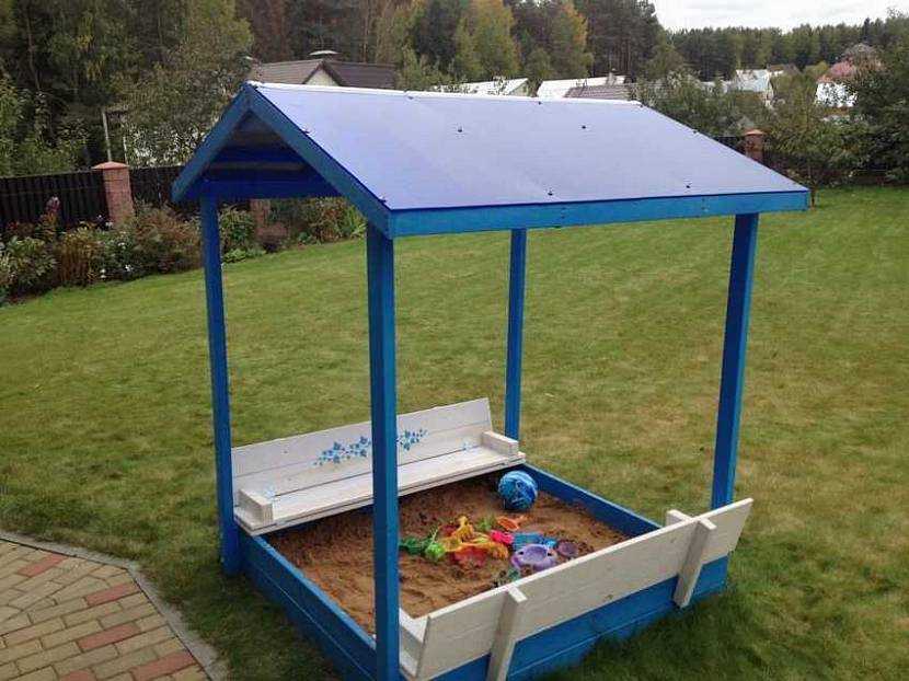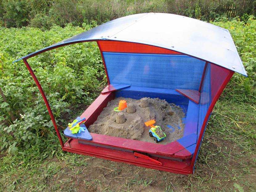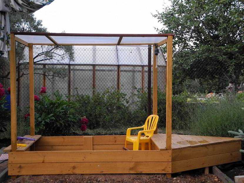 А когда снова выйдет солнце, можно вернуть крышу обратно. Такие модели хороши для небольших дач, так как из песочницы можно сделать столик или что-либо еще. Это значительно экономит пространство.