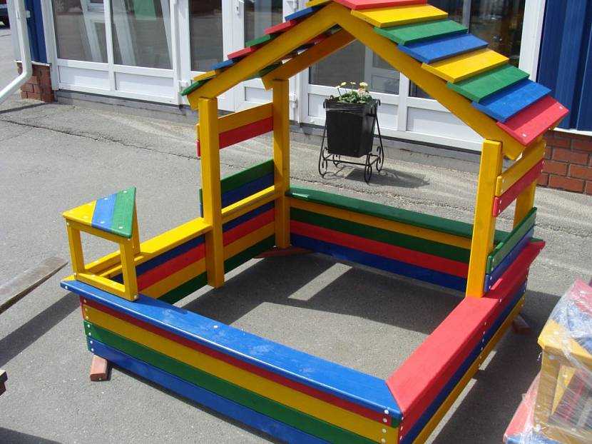 Разноцветная деревянная песочница с частичным затенениемИсточник giropark.ru