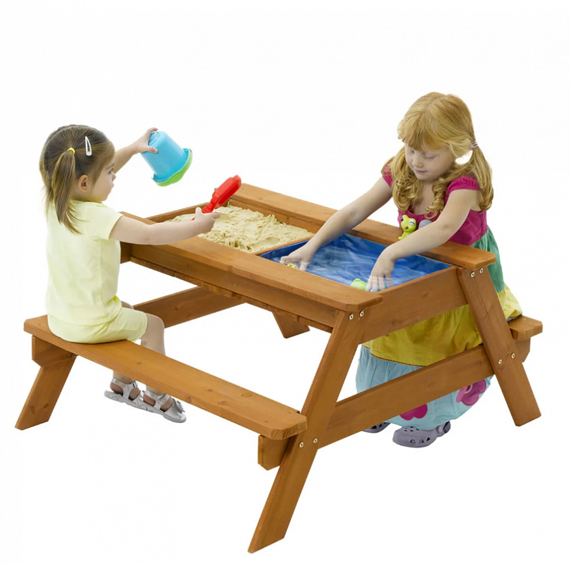 К этому типу относится стол-песочница. В момент, когда малышу надоедает возиться с песком, он легко может преобразить конструкцию в столик.