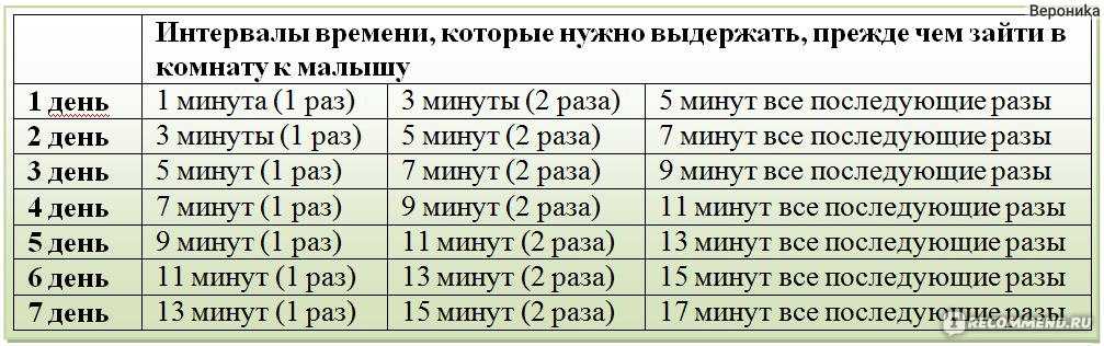Постепенно увеличивайте время разлуки перед сном. Не старайтесь жалеть малыша. Постоянно напоминайте, что заспать нужно самостоятельно в своей кровати. Врач подобрал даже необходимые промежутки времени, на которые мама должна входить из комнаты.