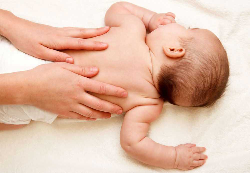 Положите ребенка на живот на твердую поверхность, чтобы его тело не «проваливалось», начните с растирания и поглаживания стоп. Легко разводите их в стороны, перейдите к голени и задней части бедра. После того как вы проведете массаж ног, переходите к ягодицам, спине.