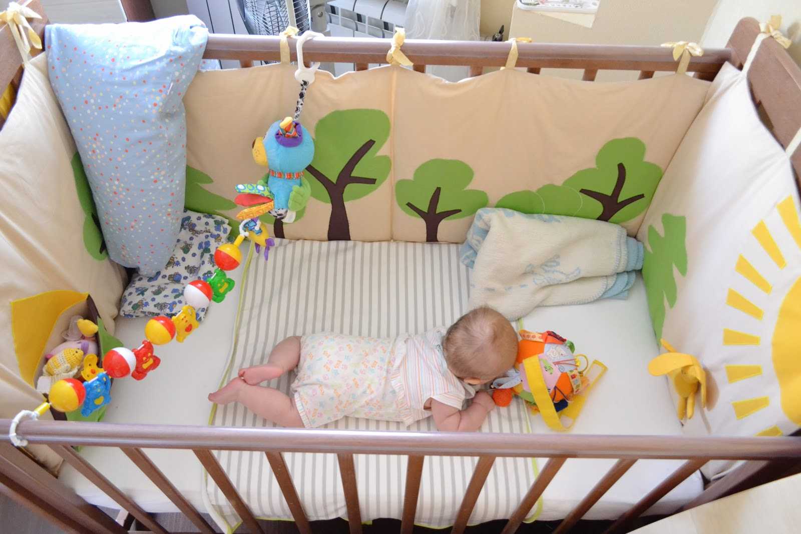 - Кроватка с высокими бортиками или люлька без одного бортика, которая устанавливается вплотную к кровати родителей. Кроватка должна иметь жесткий матрасик и мягкие бортики.