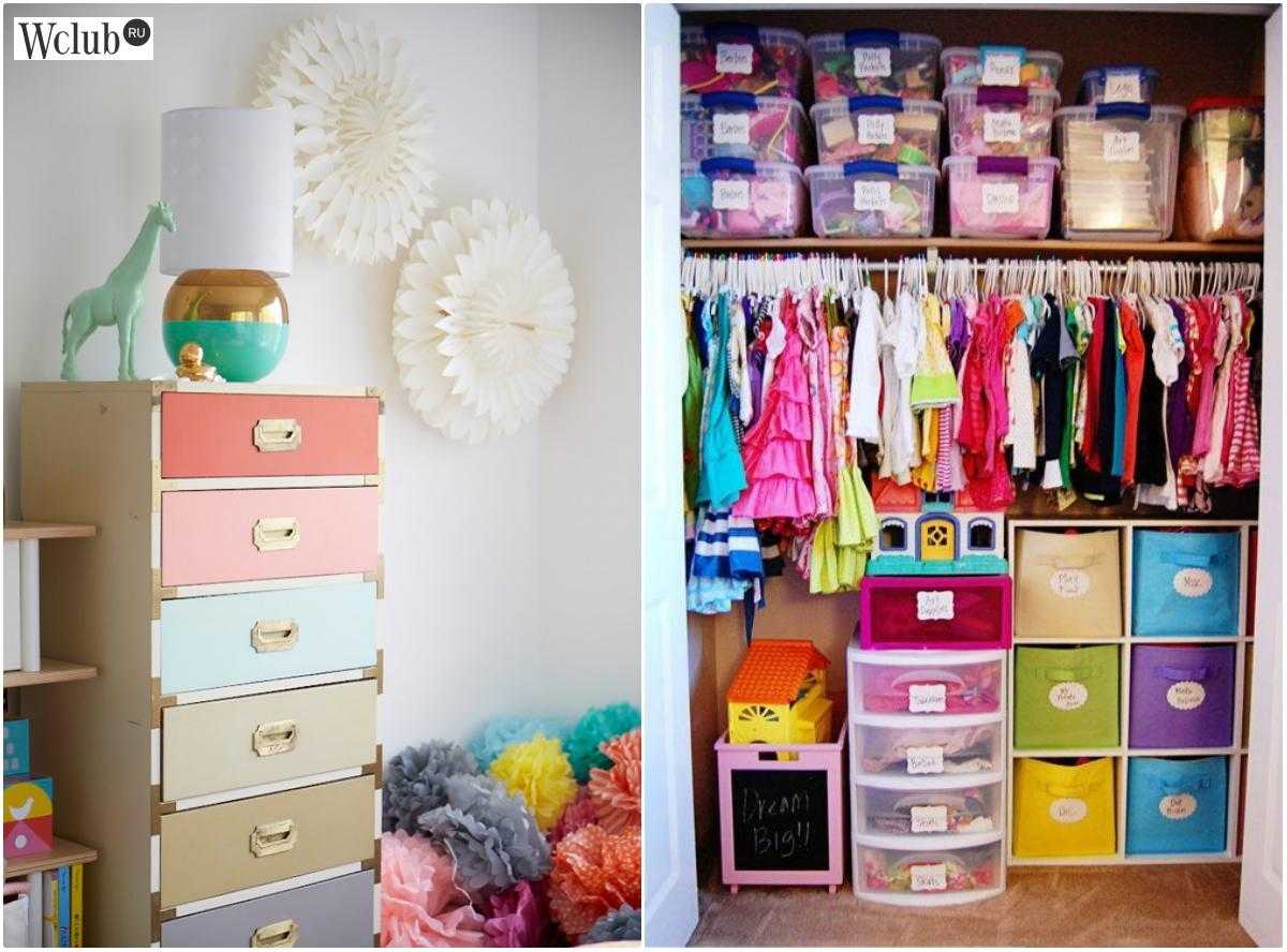 Еще Пятачок из сказки про Винни-Пуха подметил, что маленьким быть очень сложно. Не получается дотянуться до высокой полки, открыть тугой ящик, отодвинуть тяжелую корзину. Так что задача родителей — сделать так, чтобы у ребенка был свободный доступ ко всем полочкам и шкафчикам с его вещами. Если вы пользуетесь непрозрачными коробками, наклейте на них разноцветные стикеры — и малышу будет понятно, что находится внутри. То же можно проделать с ящиками комода. Чтобы ребенок дотянулся до более высоких полочек, поставьте маленькую скамейку, на которую он легко сможет подняться. На самом верху можно сложить сезонную одежду и парадно-выходные вещи, которые не используются каждый день.